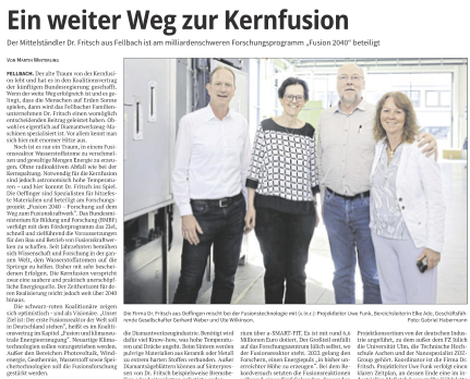 Wir von Dr. Fritsch Sondermaschinen in Fellbach freuen uns außerordentlich, unsere jahrzehntelange Expertise in der Produktion von hitzebeständigen Werkstoffen in das vom Bundesministerium für Bildung und Forschung (BMBF) mit einer Milliarde Euro geförderte Programm „Fusion 2040“ einzubringen. Im Teilprojekt a SMART FIT entwickeln und liefern wir hitzebeständige Platten für die innere Auskleidung eines Fusionsreaktors, in dem heißes Plasma mit mehr als 100 Millionen °C rotiert.