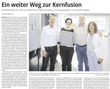 We at Dr. Fritsch Sondermaschinen in Fellbach are delighted to contribute our decades of expertise in the production of heat-resistant materials to the ‘Fusion 2040’ programme funded by the German Federal Ministry of Education and Research (BMBF) with one billion euros. In the a SMART FIT sub-project, we are developing and supplying heat-resistant panels for the inner lining of a fusion reactor in which hot plasma rotates at more than 100 million °C.